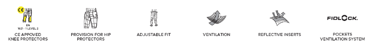 -Bộ phận bảo vệ: Bao gồm phần đầu gối, Safetech cấp độ 2 với thiết kế dễ uốn cong và bộ phận bảo vệ hông tùy chọn, Safetech cấp độ 1 với thiết kế dễ uốn cong.