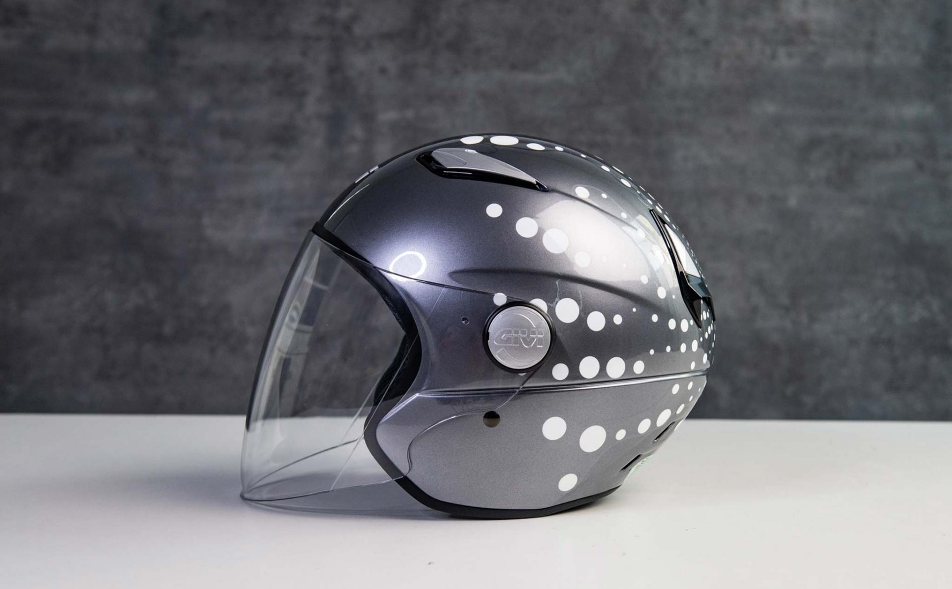 Mình rất thích kiểu nón của GIVI cũng như mức giá mềm nên đã mua về một cái nón 3/4 có kính với giá 1.050.000 ngàn đồng. Nó có 2 màu titan và trắng và phía bên trên có các họa tiết chấm bi sơn dạ quang có thể phát sáng ban đêm. Ban ngày những chấm bi này sẽ hấp thụ ánh nắng và vào ban đêm nó sẽ phát sáng giúp người khác dễ nhận biết anh em hơn.